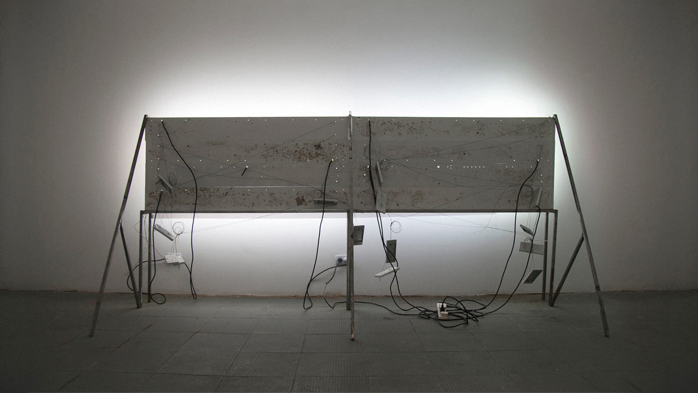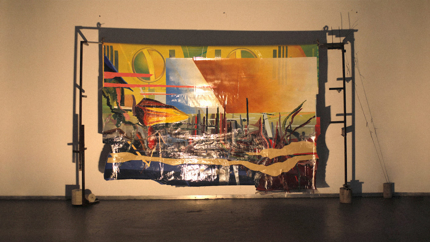 Acrilico sobre lona publicitaria, estructuras de caños y cemento.