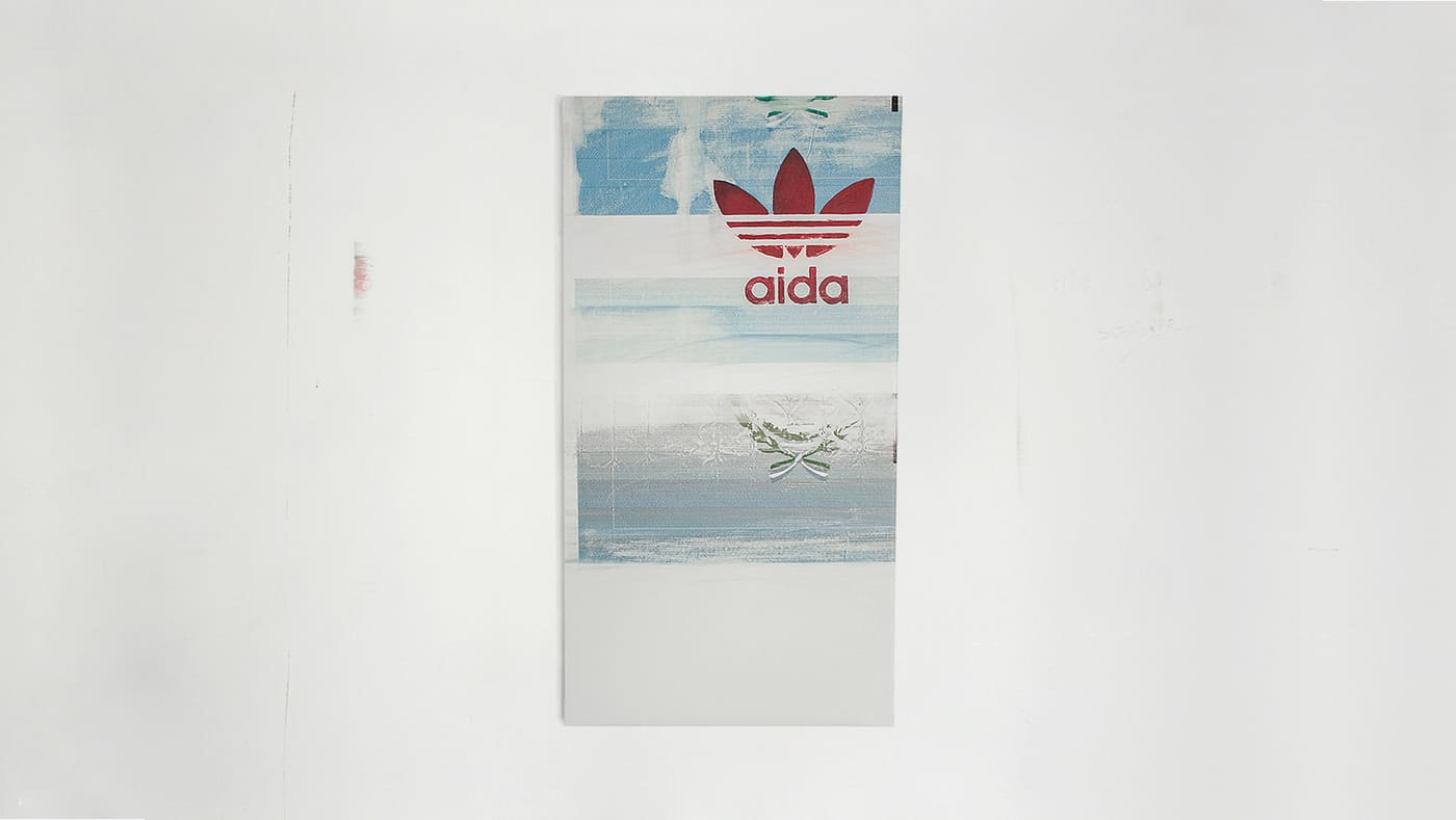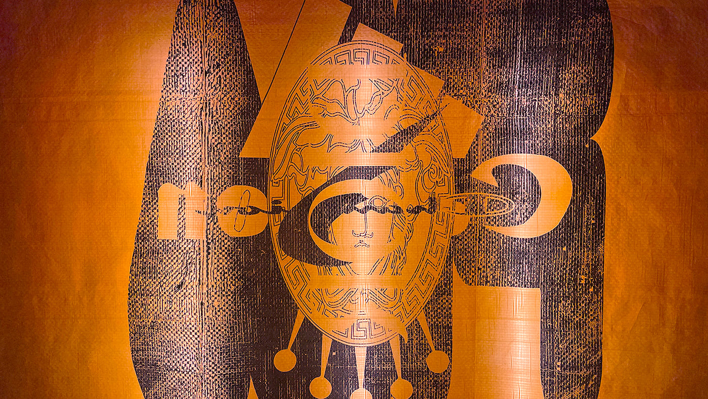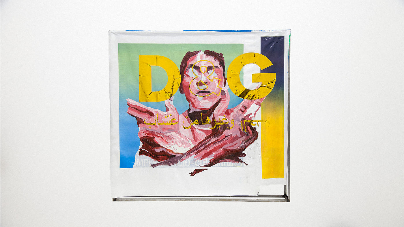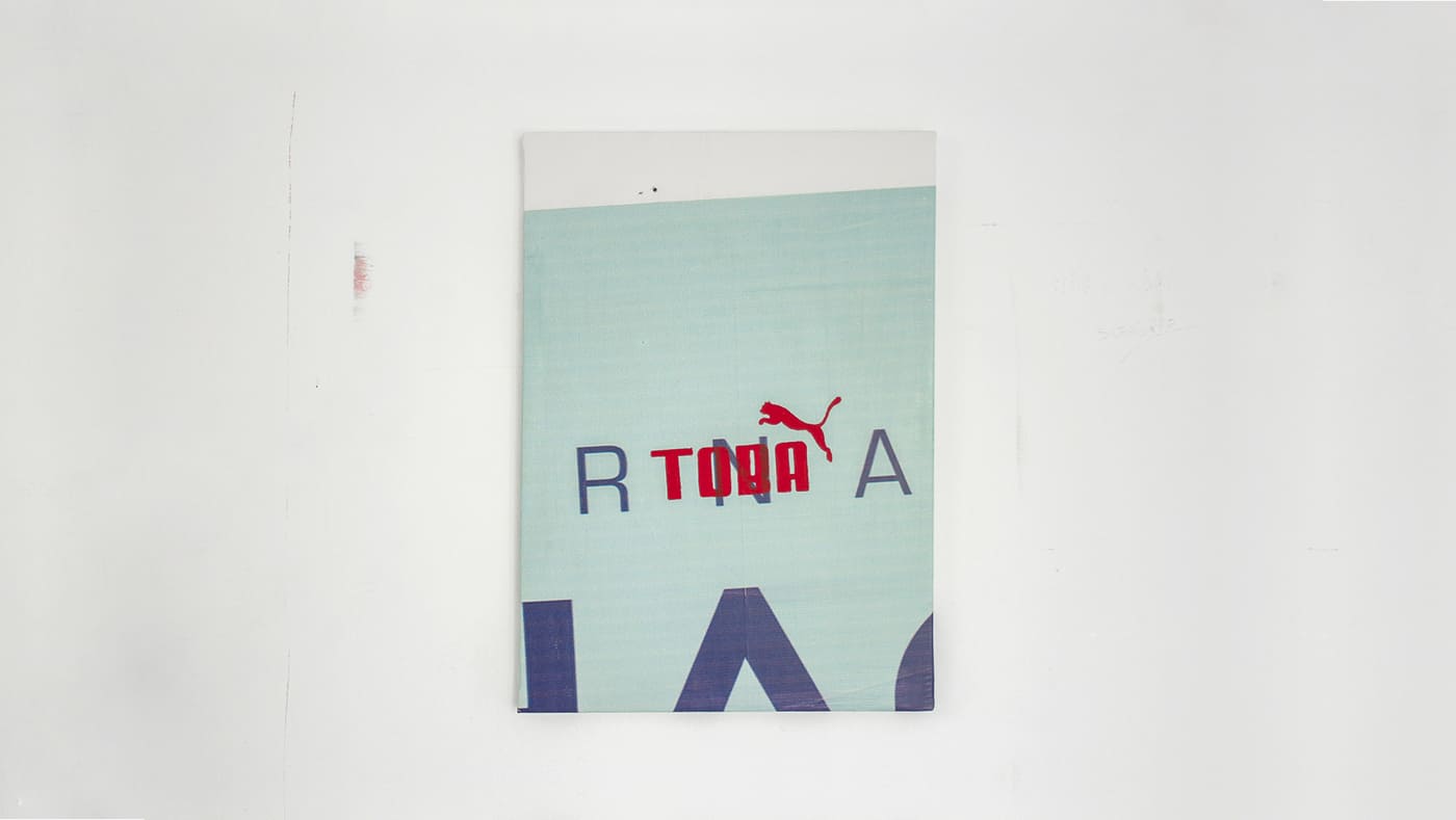 Hidroesmalte y látex en lona impresa sobre estructura publicitaria.